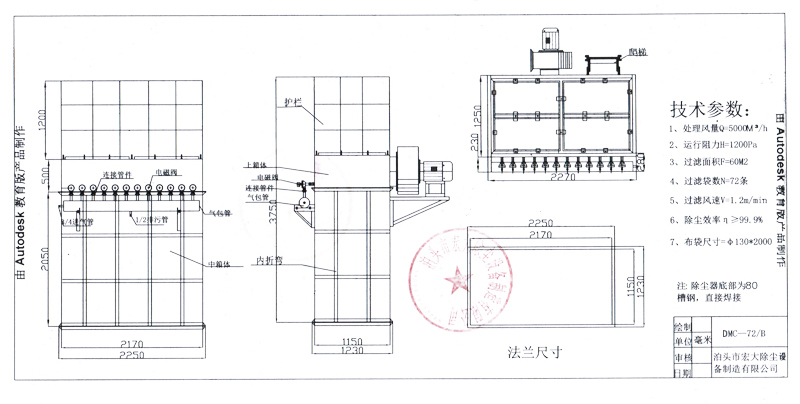 ( 1 )箱體:包括袋室、凈氣室、多孔板、 濾袋 、濾袋骨架、檢修門(mén)、箱體設(shè)計(jì)耐壓 5000Pa 。