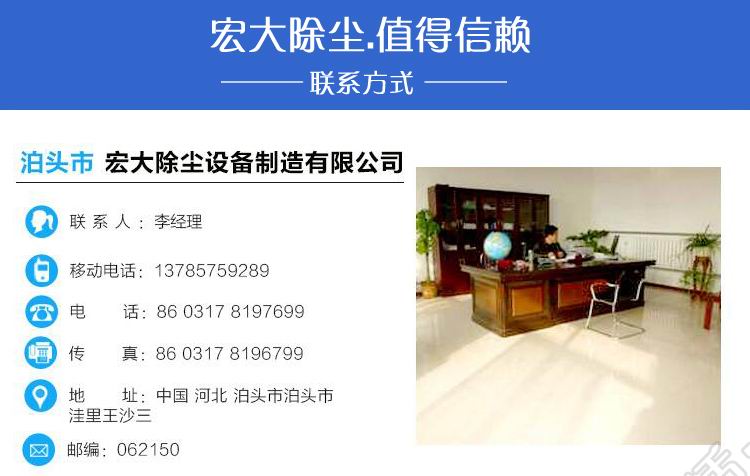 公司名稱(chēng):泊頭市宏大除塵設(shè)備制造有限公司 公司地址:泊頭市開(kāi)發(fā)區(qū)環(huán)城東路南首1號(hào) 電話:0317-8392799 8162866 傳真:0317-8392977 手機(jī):18931764475 網(wǎng)址: