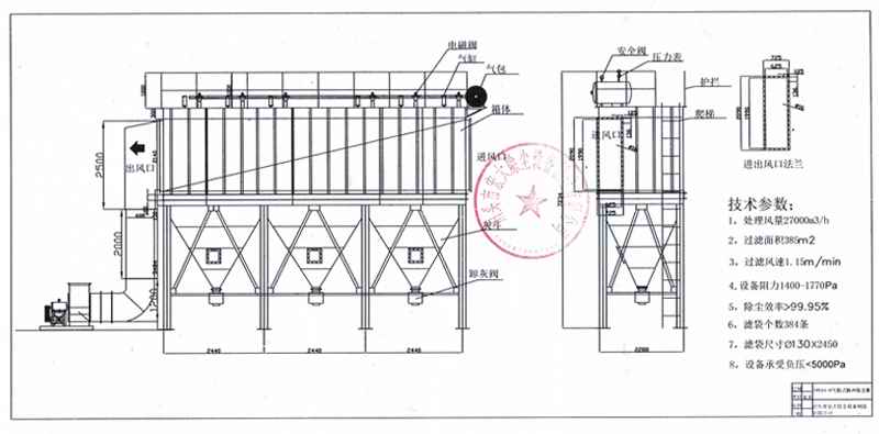 氣箱脈沖收塵器產(chǎn)品共有33種規(guī)格,每室的袋有32、64、96、128袋四種,濾袋長度有2450mm和3060mm兩種,收塵效率可達99.9%以上,凈化后氣體的含塵濃度小于100mg/m3(標)本系列收塵器如用于寒冷地區(qū),當室外采暖計算溫度≤-25℃時,要設熱裝置。